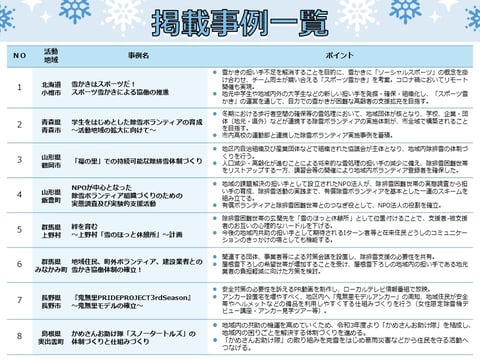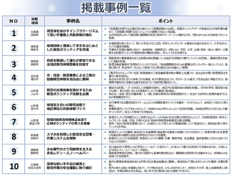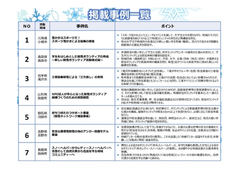 各団体の取組の要点(実施主体、活動地域、きっかけ、取組内容、主な成果、事例ポイント、写真など)をパワーポイント1枚ずつにまとめています。