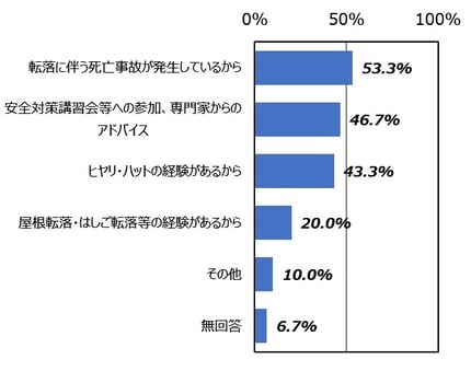 安全対策を実施するようになった理由は、「転落に伴う死亡事故が発生しているから」(53.3%)が最も多く、2番目に「安全対策講習会への参加、専門家からのアドバイス」(46.7%)が多く、「ヒヤリ・ハットの経験があるから」(43.3%)も多くなっています。