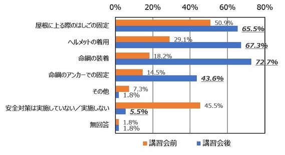 参加者の多くは、安全対策講習会の受講を通じて、命綱の装着も含めた安全対策の実施意向が高まっており、事故防止対策の普及に向けては、高齢者等に直接アプローチする安全対策講習会の開催が有効であることも確認できました。
