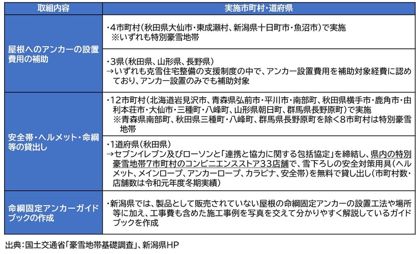 新潟県のように条例によって屋根雪下ろしを行う住民に対する規定を設けることで、一層の安全対策の普及が見込まれます。また、同様に屋根雪下ろしを行う必要のある新築住宅について、アンカー設置を条例に規定することで、アンカーの普及にも効果があるものと考えられます。